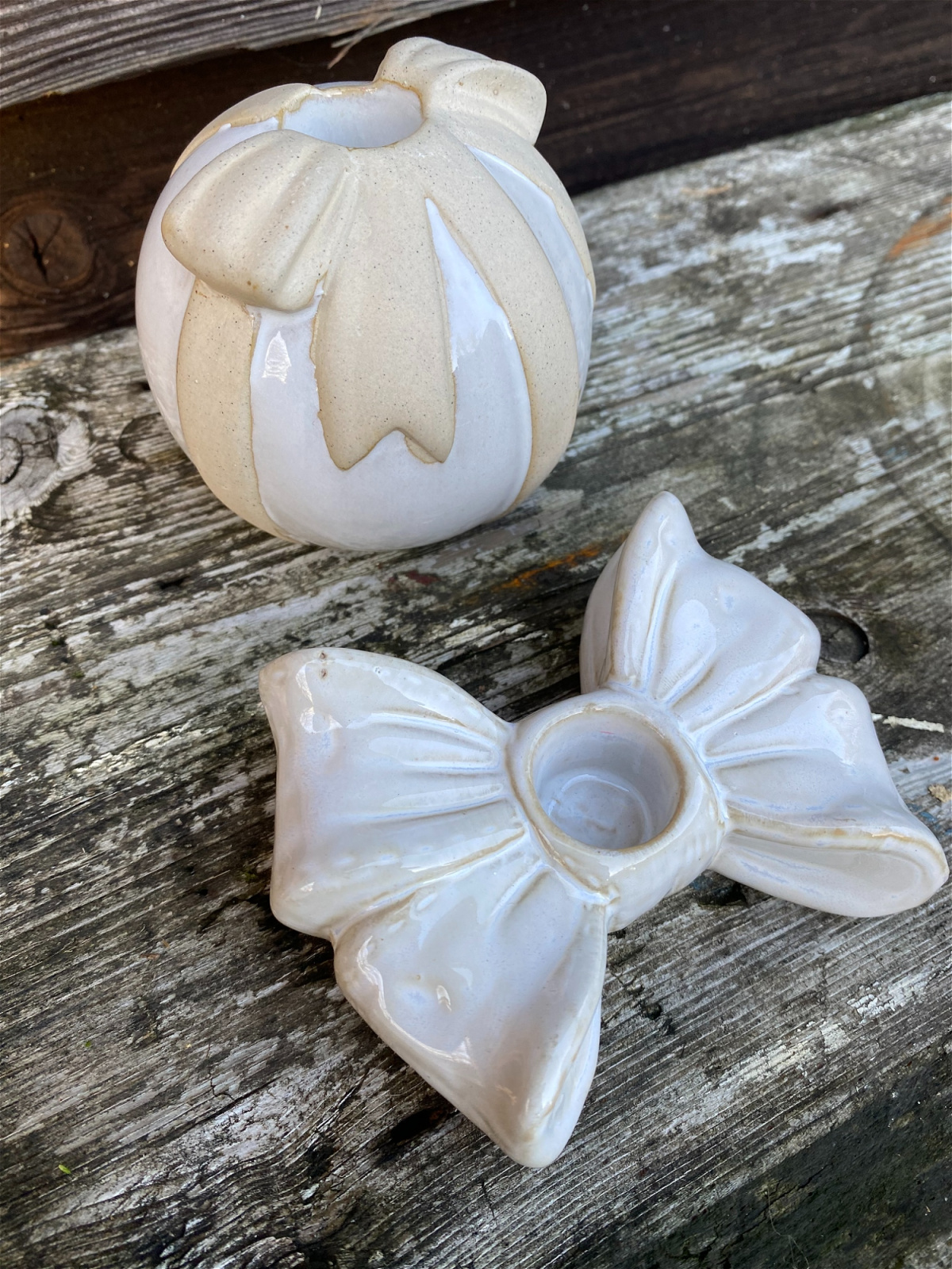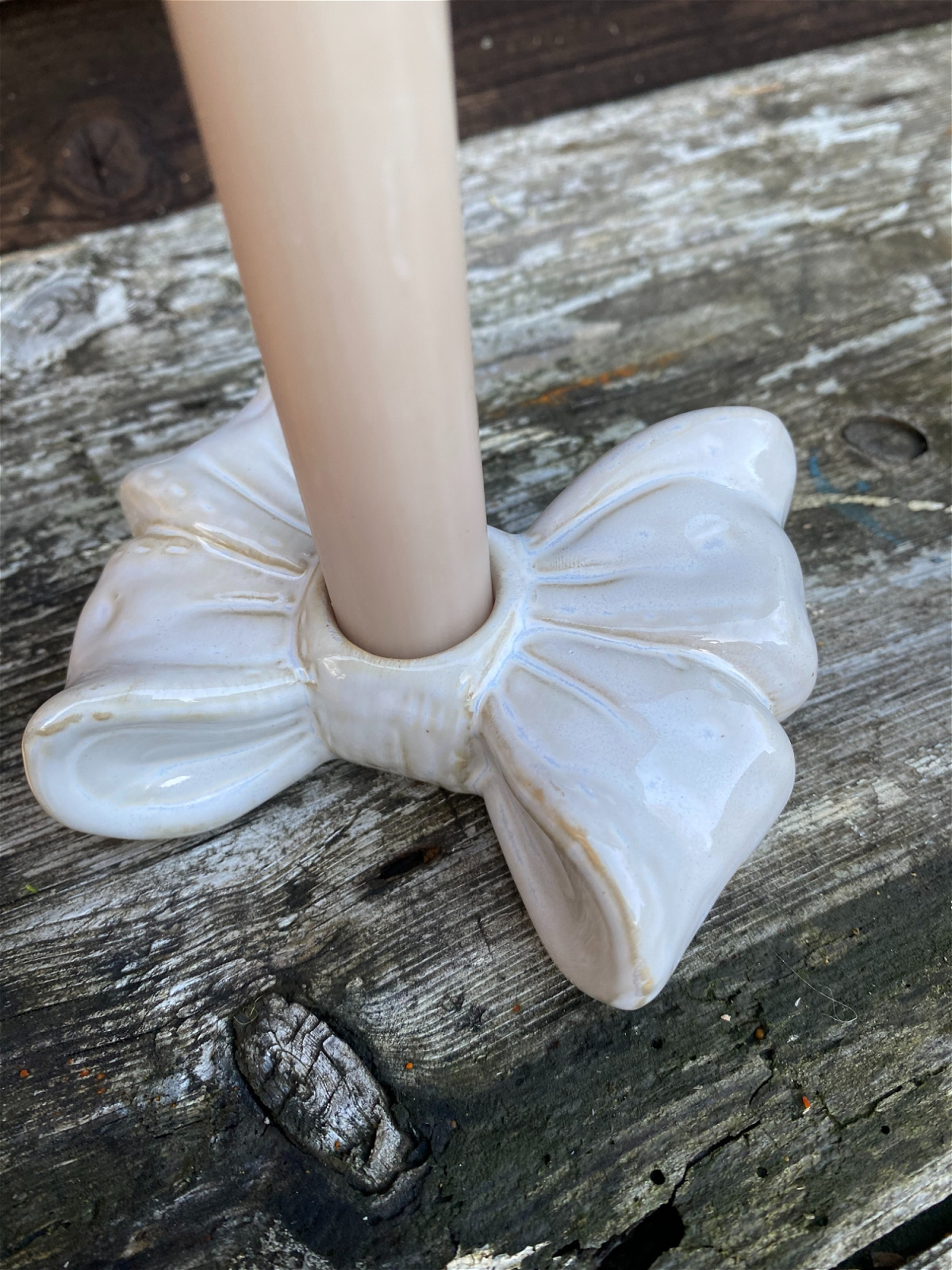Available as a ceramic bauble or glazed bow, these gorgeous candle holders hold a single dinner candle.